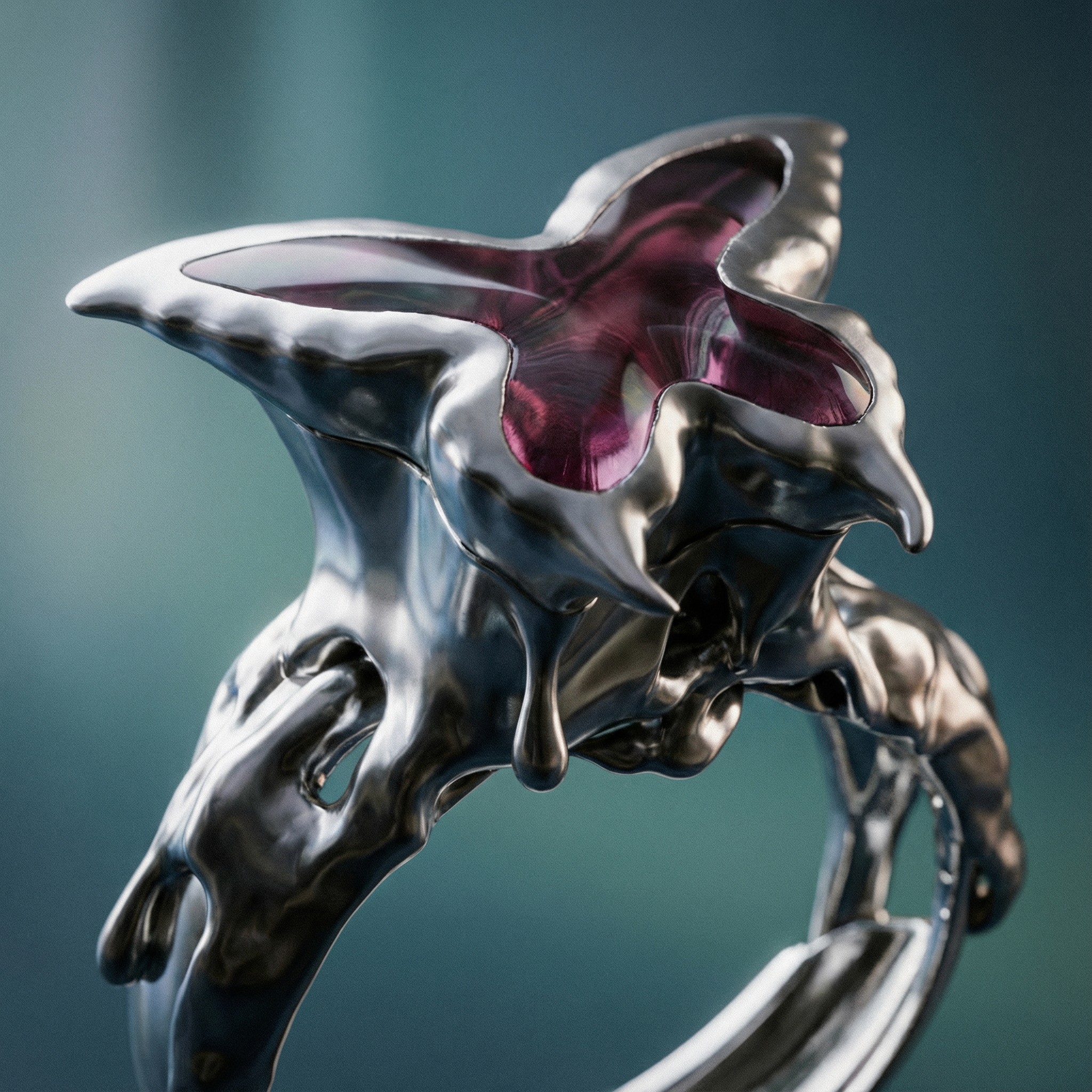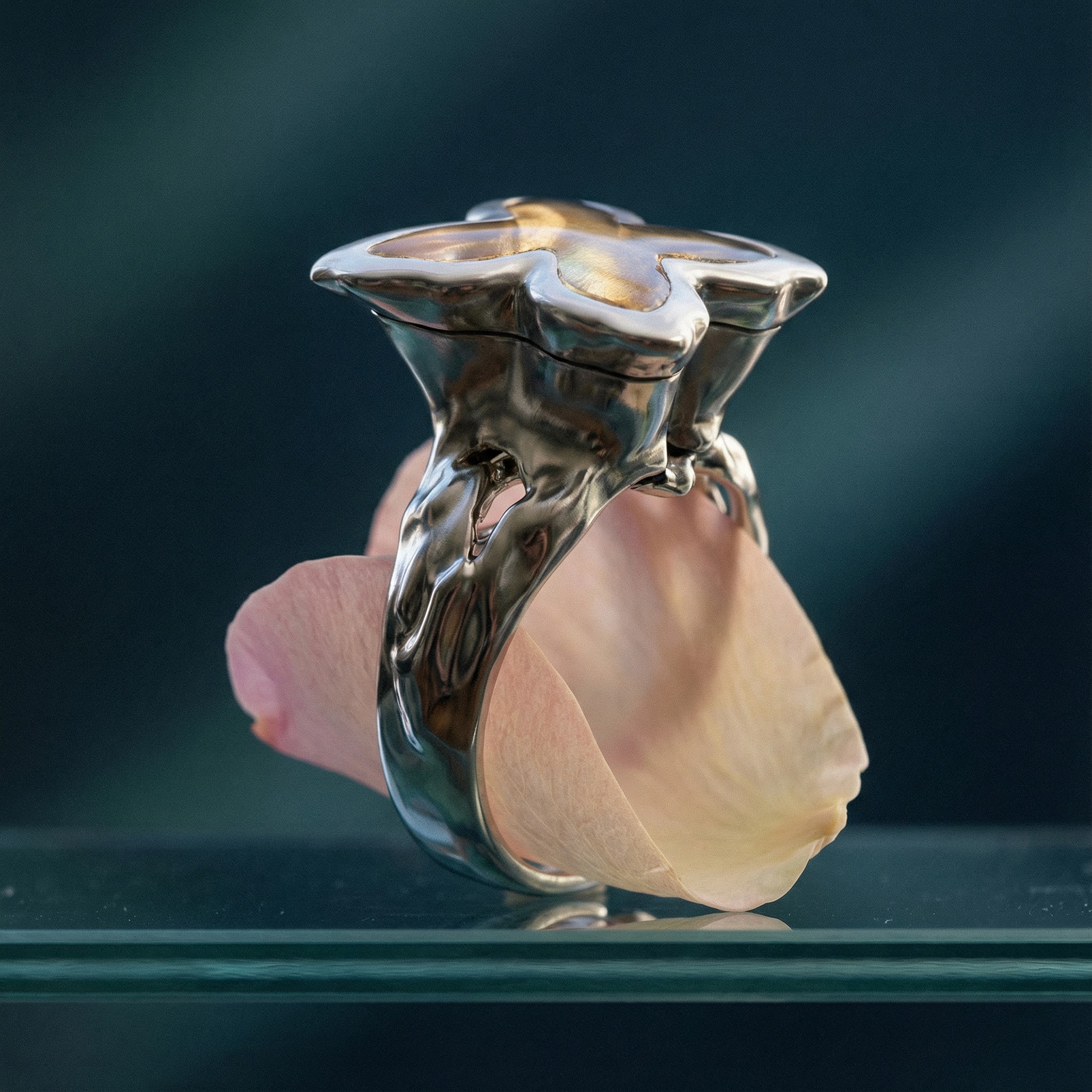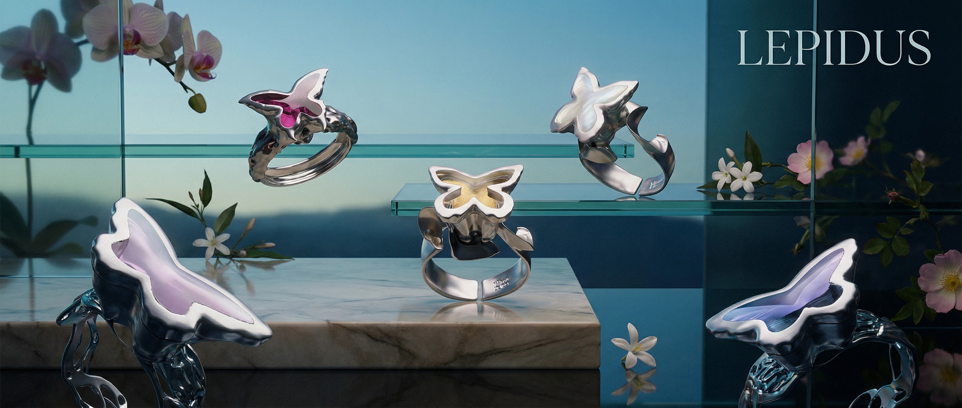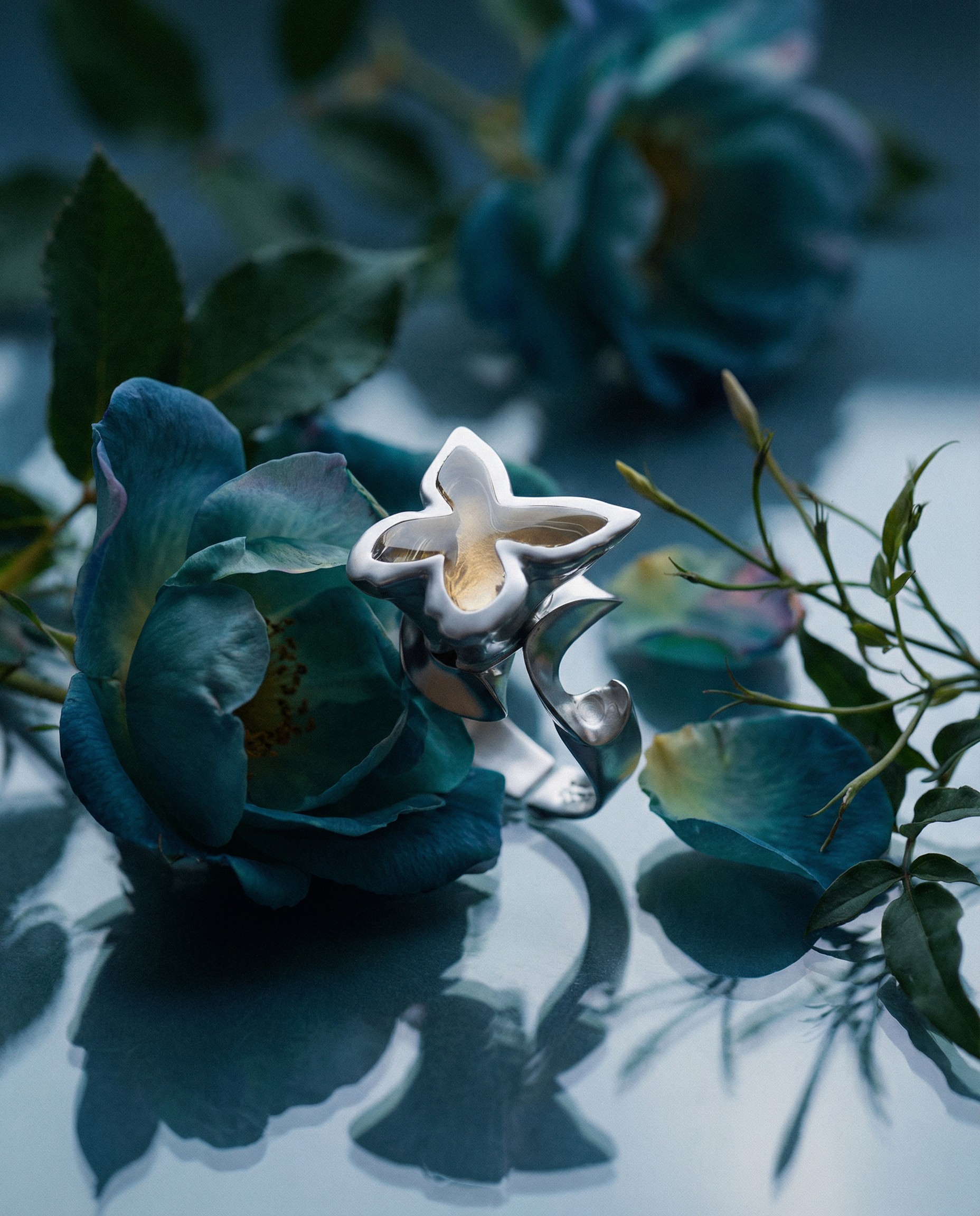 By merging structured metal with botanical and liquid elements, it explores the tension between precision and unpredictability.