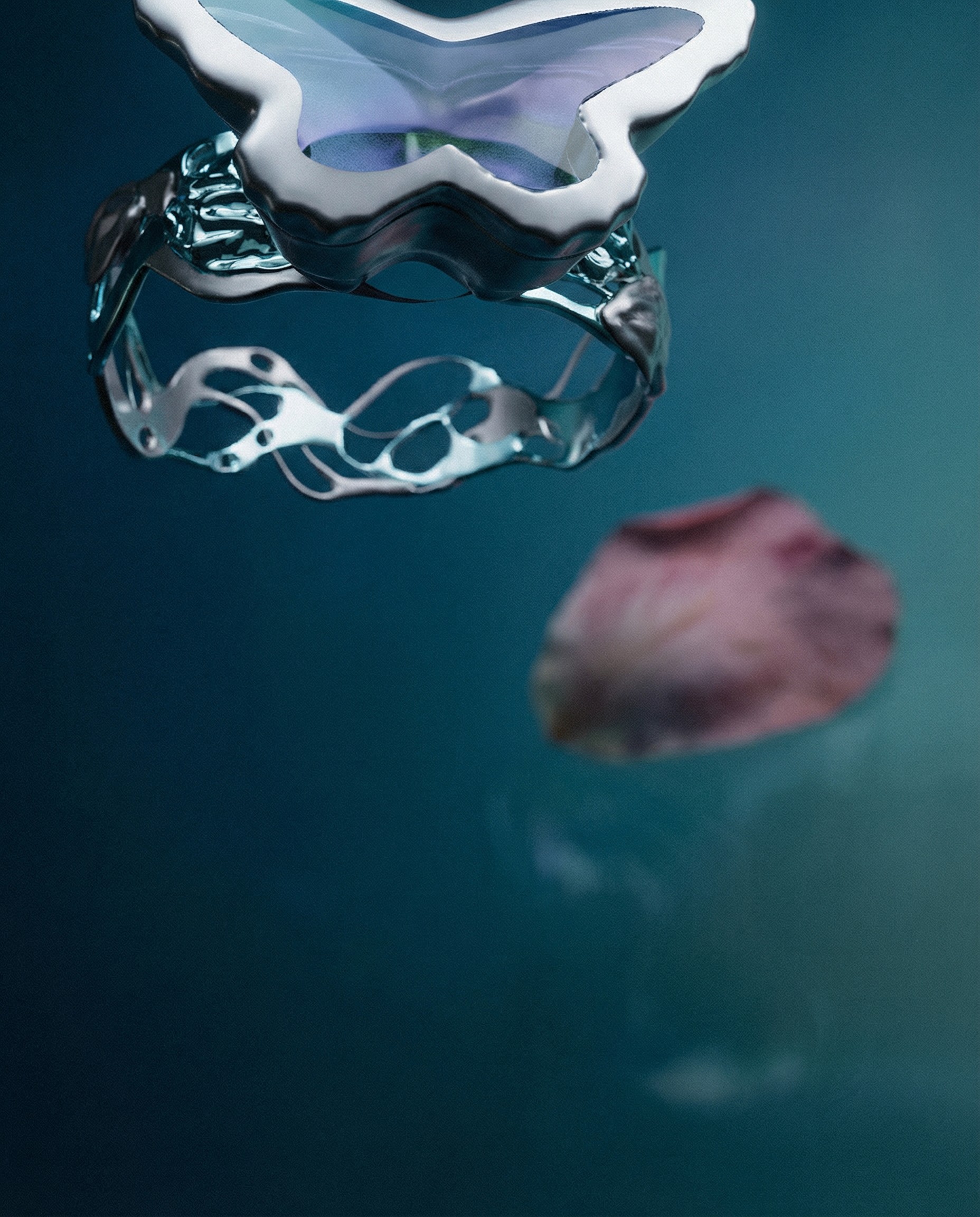 The work starts with a controlled, sculptural form built in 3D, then evolves through AI into a softer, more fluid visual language.
