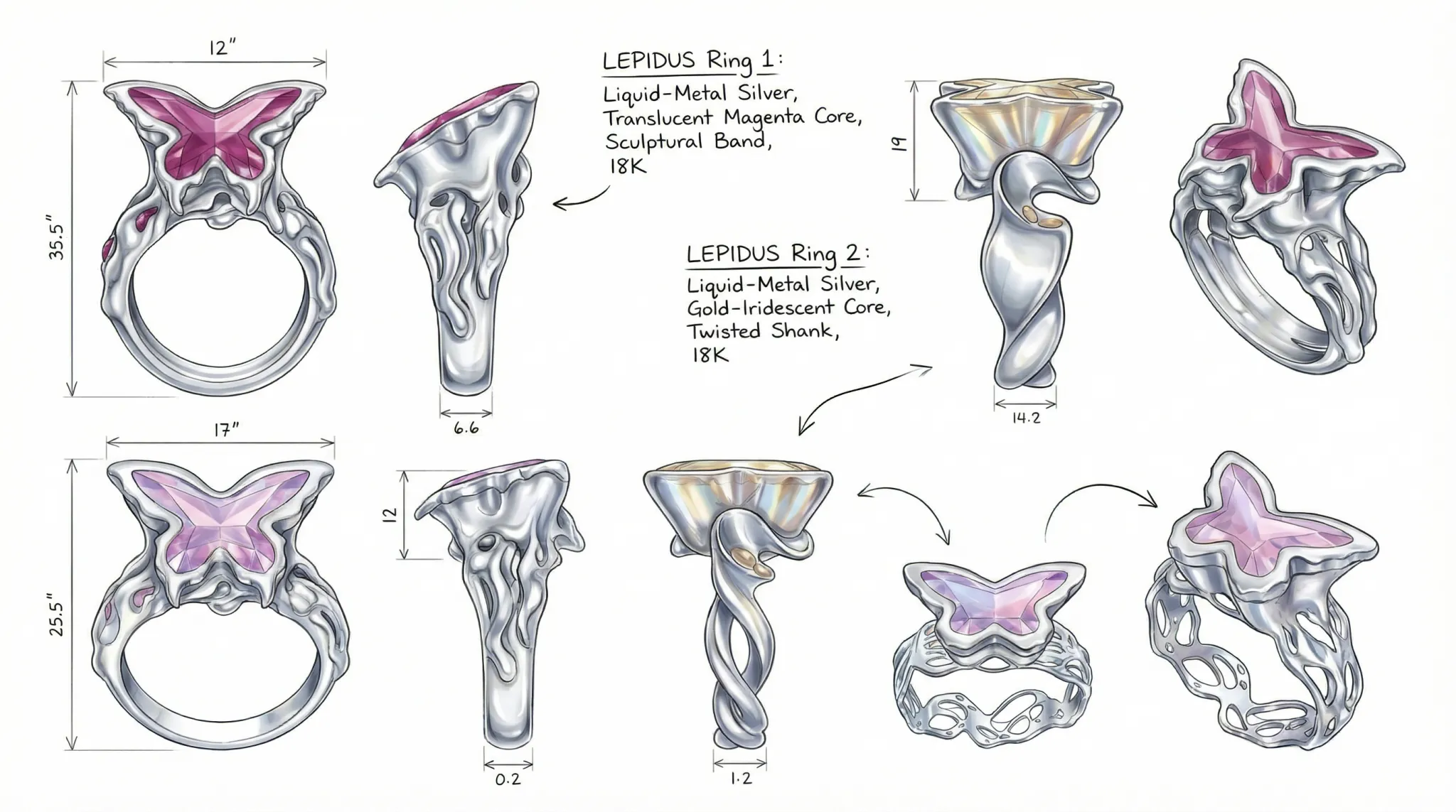 This series began with hand-drawn sketches exploring fluid, organic forms within structured jewelry design.